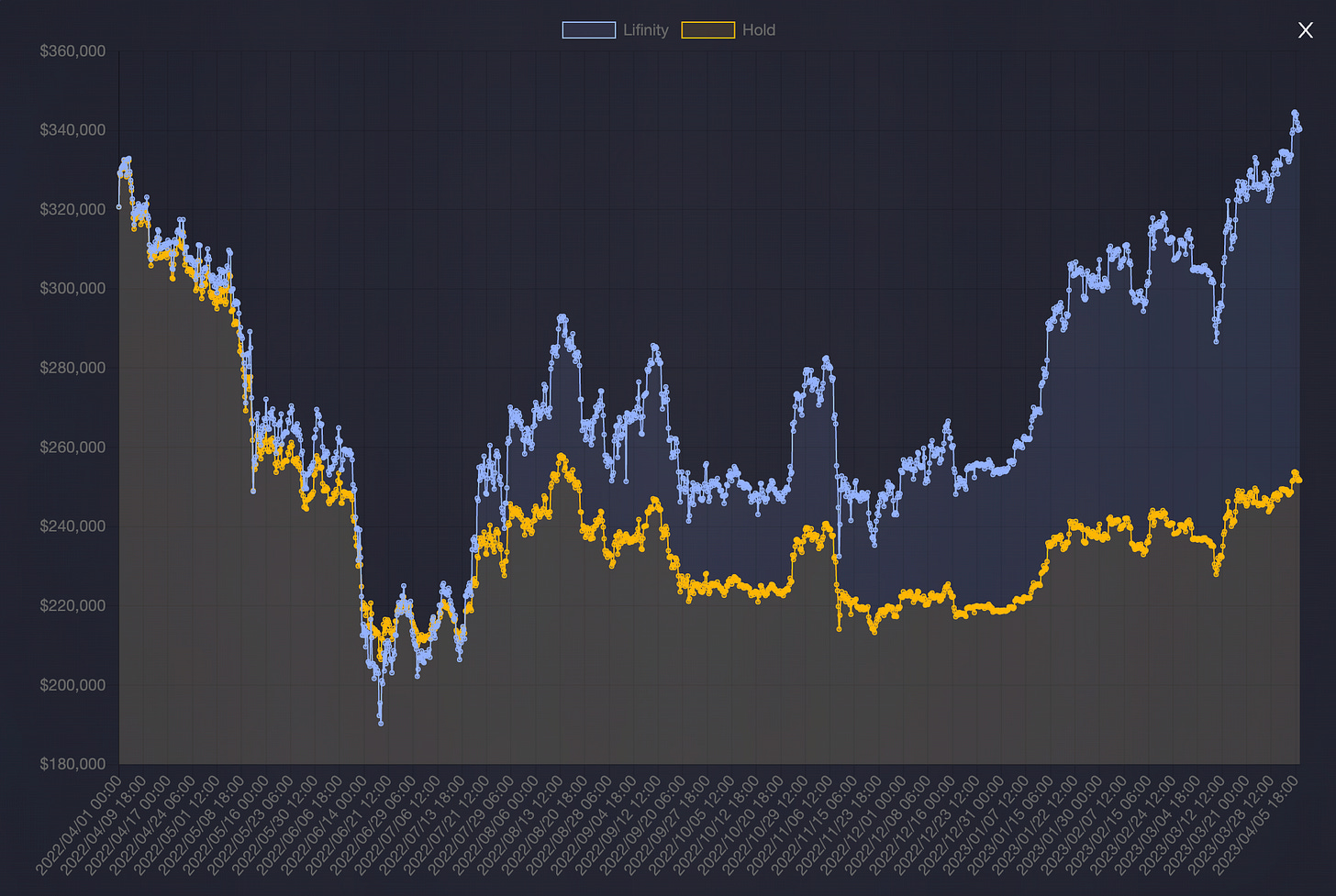 As shown below, the ETH-USDC Lifinity LP accrued 35% more value than if you were holding ETH and USDC in your wallet.